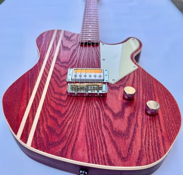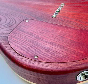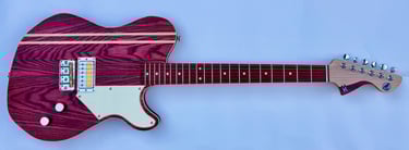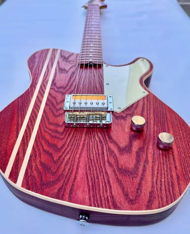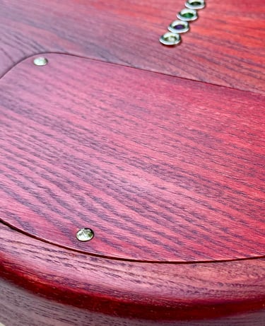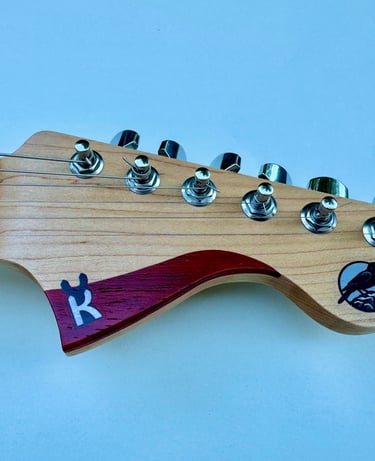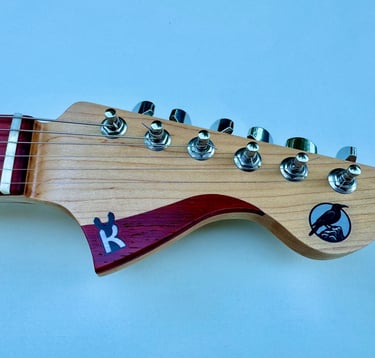 This features a custom body shape and headstock designed by me and inspired by the Telecaster, Jazzmaster and Firebird. An offset style body with subtle comfort carves and generously rounded edges is paired with a solid flat headstock neck that ends in in an elegant headstock inspired by larger 70's designs and features a signature inlaid contrasting curve.